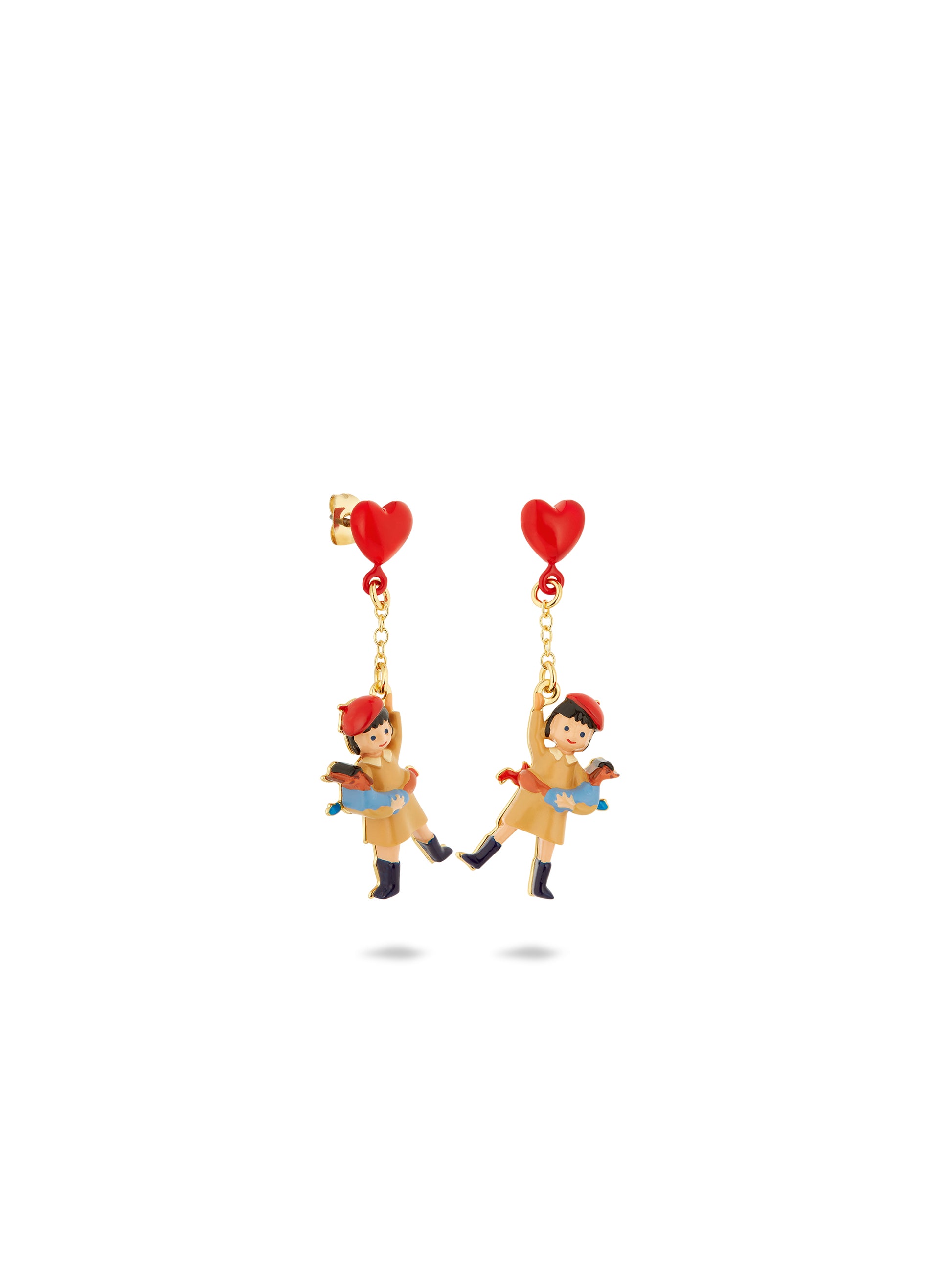 Earrings showcasing a little girl dressed in a red beret and a yellow dress. She is hanging on to a heart-shaped balloon with one hand and carrying a dachshund with her other arm. On what one might imagine to be an autumn afternoon in the Tuileries garden, a little girl, let's call her Madeleine, walks with her dachshund, let's call him Octave. From ride to ride, this hand-painted resin jewellery takes us into the wonderful world of funfair rides, candy apples, candy floss, and ittle ducks.