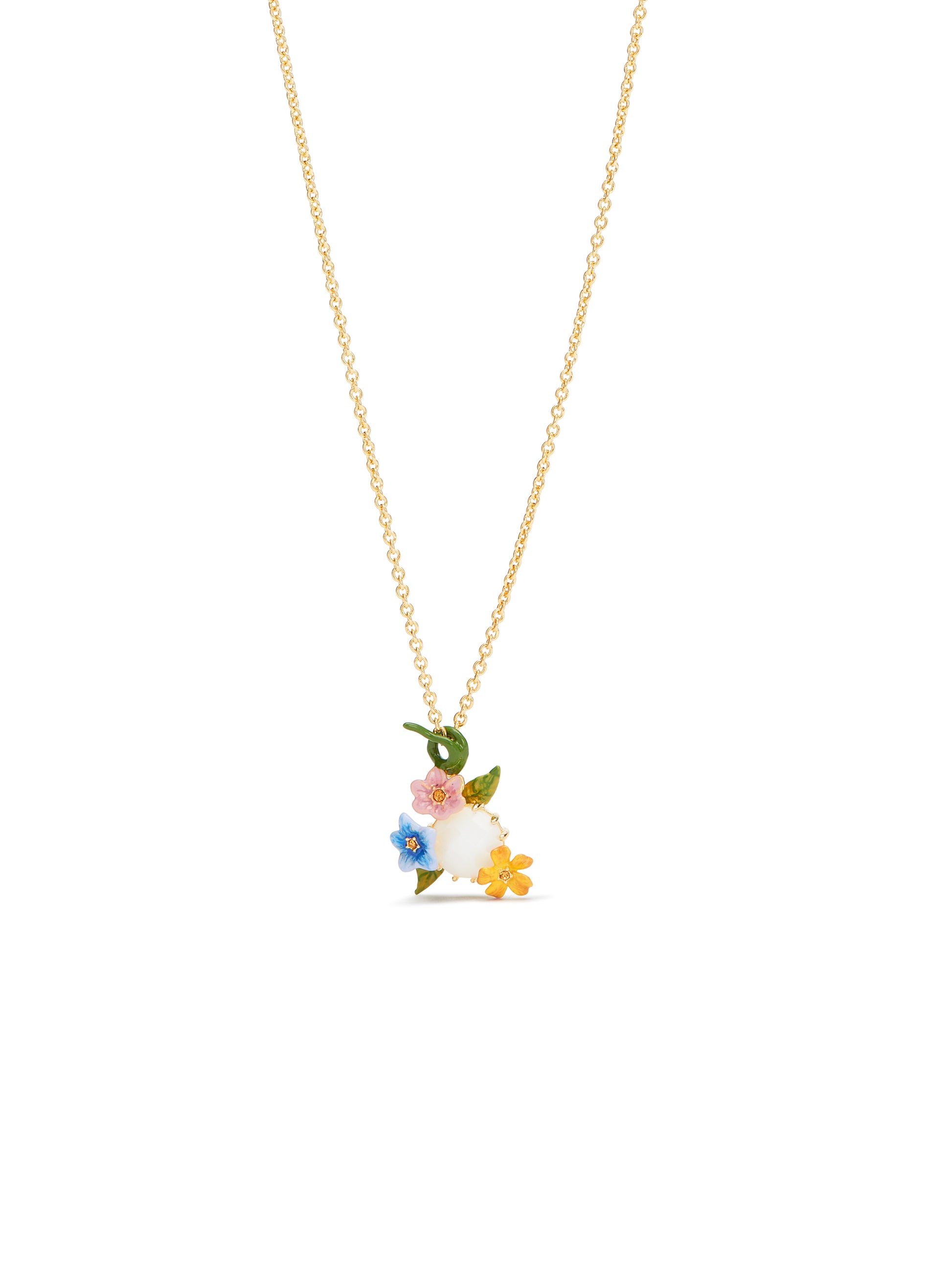 Pendant necklace, faceted pearly effect crystal stone on which three hand-enamelled colourful jasmine flowers rest. Time to Dream showcases a solanum flower to bring a touch of freshness to the compositions.