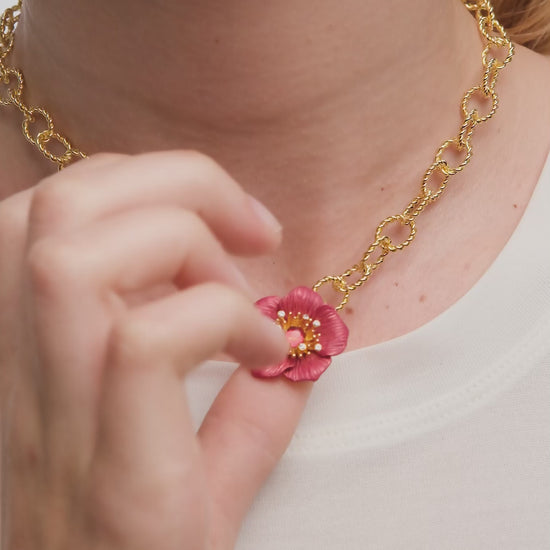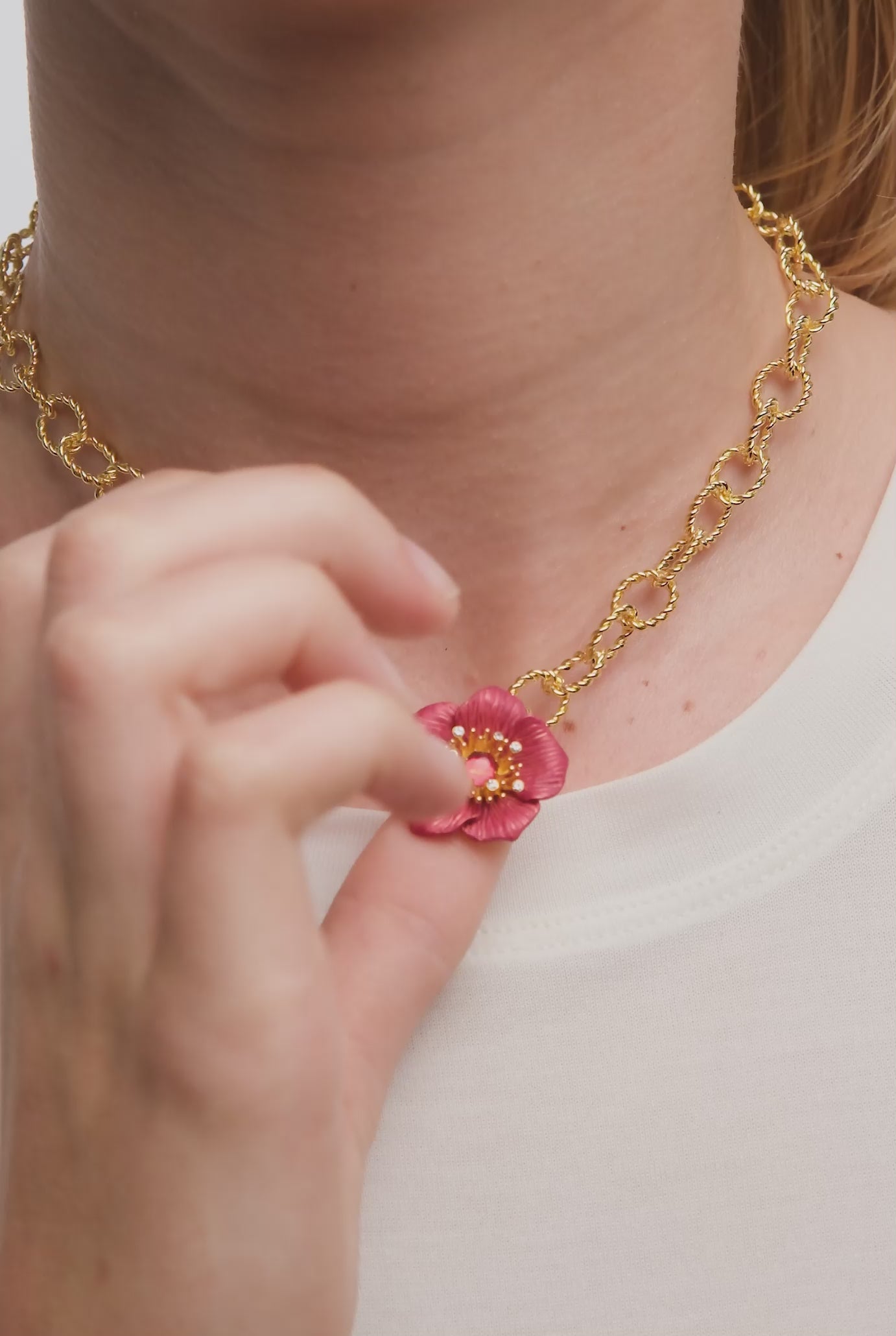 On this pendant necklace, a red hellebore flower is showcased on a magnificent chain composed of gold-plated twisted rings. La Maison Les Néréides unveils the Winter Velvet collection to celebrate snowdrops and hellebores, the last flowers of the season. A bullfinch twirls here and there in this collection with particularly intricate settings.