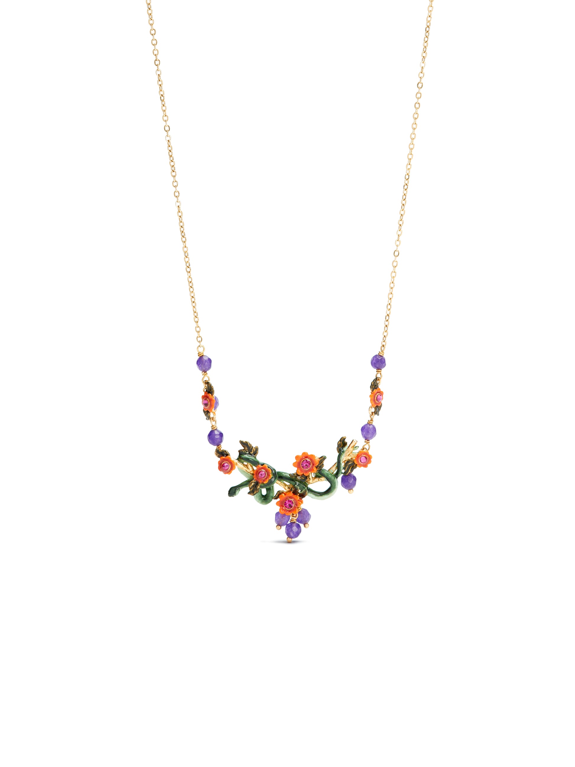 This statement necklace showcases a finely hand-enamelled snake, together with orange flowers and purple crystal beads. In the middle of a lush Eden, a myriad of colourful birds mingle with exotic flora. A stunning snake and a vine leaf adorn this set, symbolising the Tree of Life collection.Materials