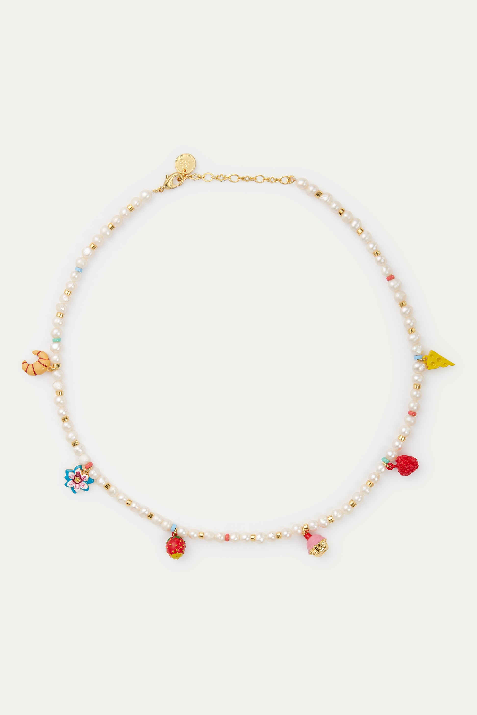 Necklace adorned with white artificial pearls, composed of hand-enamelled croissant, flower, strawberry, pastry, raspberry and cheese charms. The Happy Picnic collection follows a cat family on a sunny day in Paris, together with their friend the dog.
