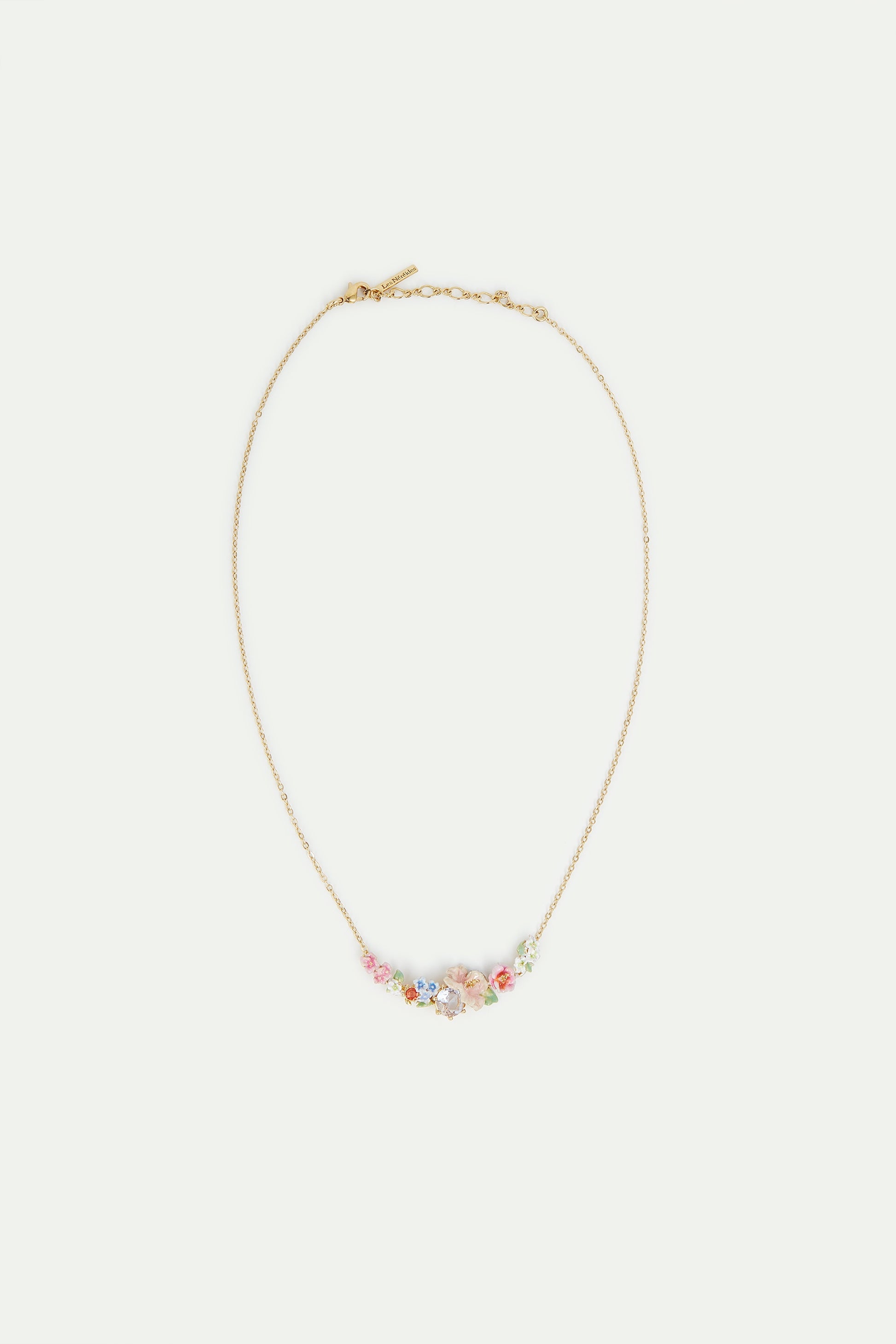 Statement necklace composed of hand-enamelled flowers: hollyhocks and hydrangea flowers in blue, pink and white. The centre is an emerald-cut white faceted crystal stone, together with a red faceted crystal. The collection Hortense's Garden is a sweet celebration of hydrangeas and summer gardens. Its different shades of pink captivate us, symbolising a beating heart, as reminded by its bouquet. Pink is the colour of budding love, in the guise of a flower that, even in the absence of water, loses none of its splendour.