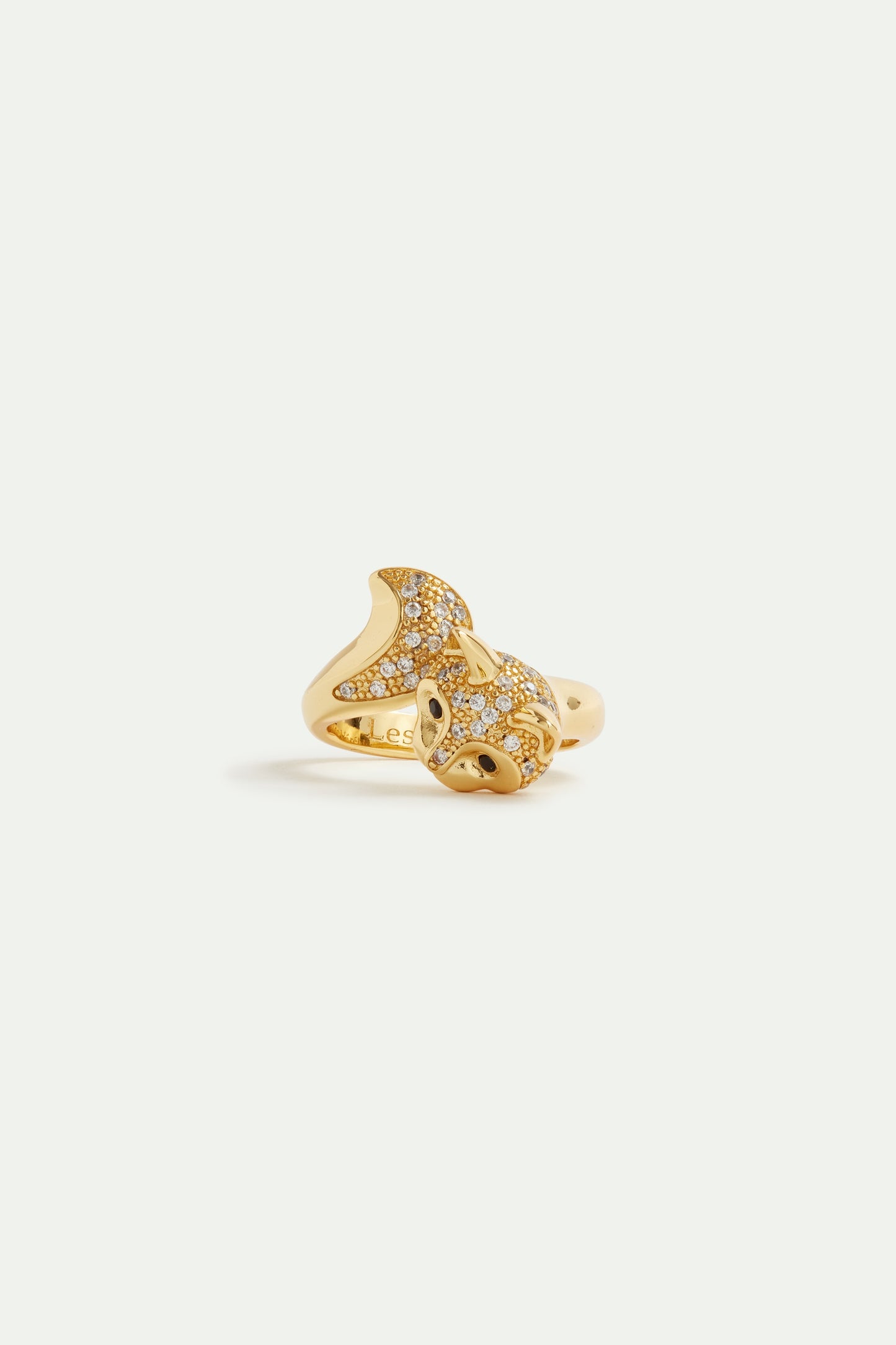 Adjustable gold-plated brass ring with a cat's head studded with cubic zirconia. This season Les Néréides Loves Animals pays tribute to cats. For almost 10 years, the LNLA foundation has donated 15% of the sale price of each piece of jewellery from this collection to animal welfare organisations. Nearly two thirds of the animals taken into care by the french RSPCA in 2023 were cats, and today more than ever the protector needs to be protected in return.