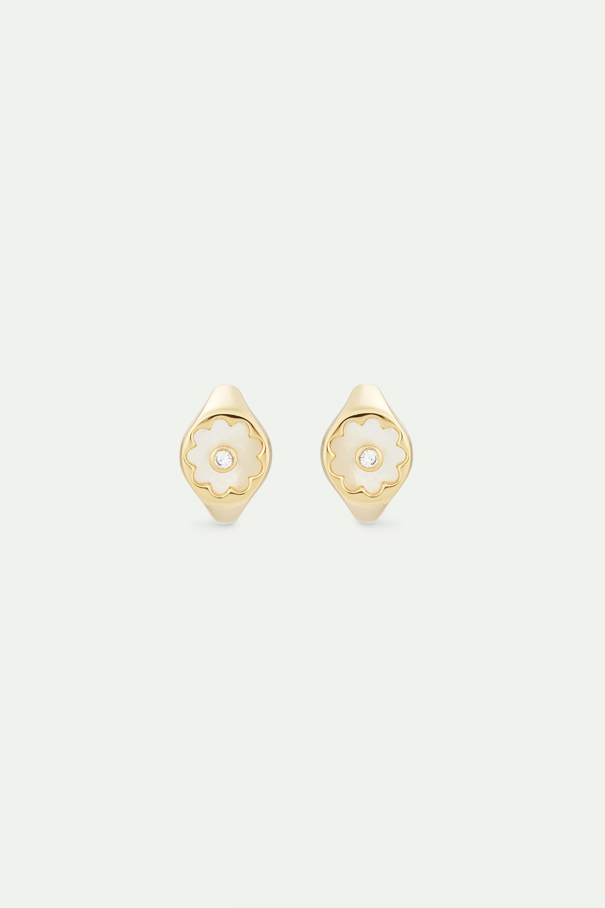 Invisibly hinged mini hoop earrings in gold-plated brass with a small white mother-of-pearl flower motif adorned with cubic zirconia. With Secret Trail, the Rock Flower collection comes in a set of gold-plated jewellery adorned with fine stones, and inspired by rocky mountains.