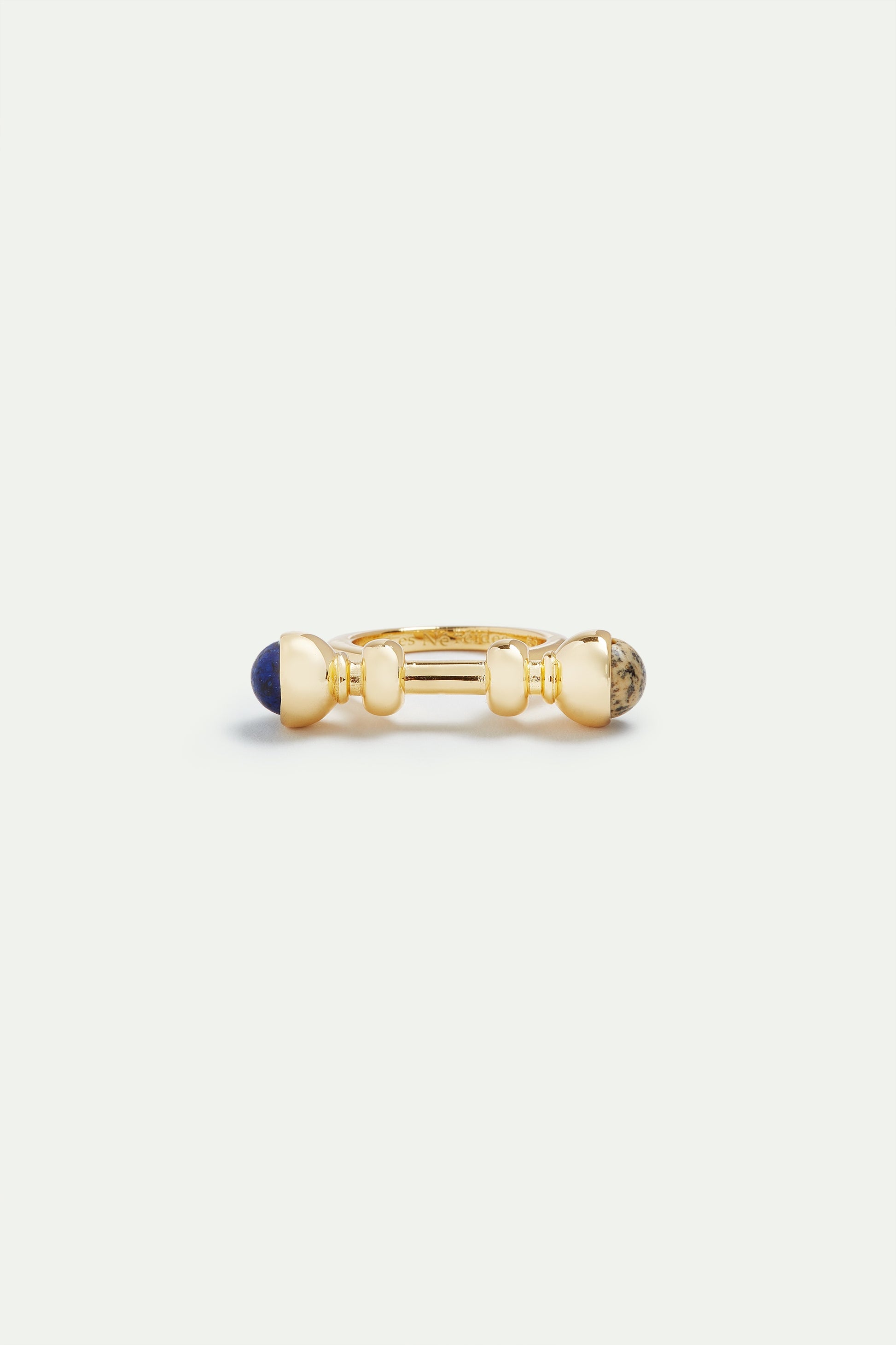 Gold-plated brass ring with a beaded bar adorned with lapis lazuli and jasper beads. With Secret Trail, the Rock Flower collection comes in a set of gold-plated jewellery adorned with fine stones, and inspired by rocky mountains.