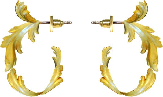 Hoop earrings with gold-plated brass acanthus leaf crown. Les Néréides has worked with the Palace of Versailles to design jewellery inspired by the symbolism of Louis XIV, architectural elements and the lush gardens of the palace.
