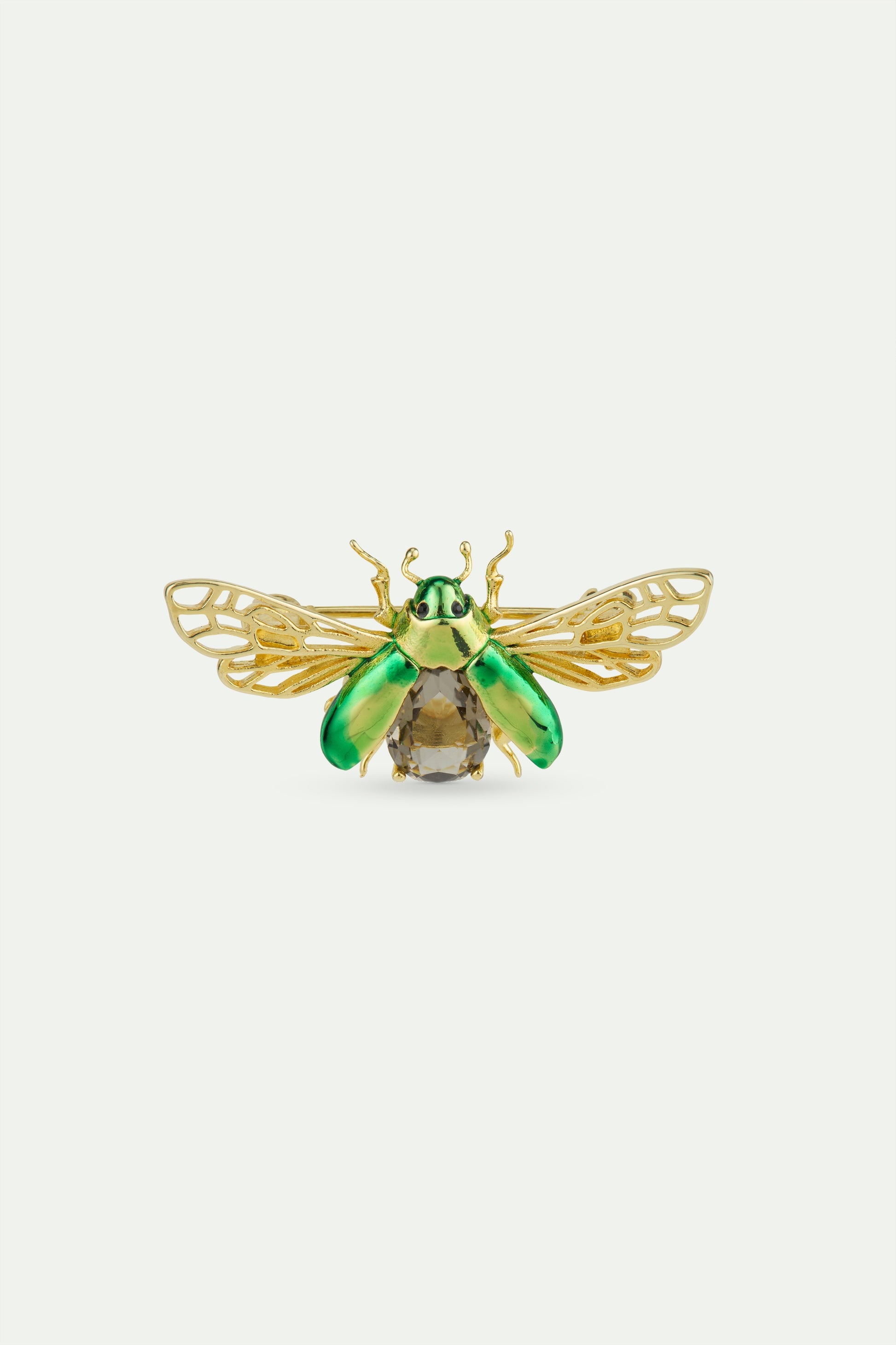 Large rose chafer brooch, hand-enamelled metallic green beetle, black faceted crystal stone, gold-plated brass wings. The Cabinet of Curiosities collection draws its inspiration from the fascinating world of the Natural History Museum in Paris. A dreamlike journey among rare orchids, fiery corals and sparkling beetles, offering a marvelling glimpse into the mysteries of life.