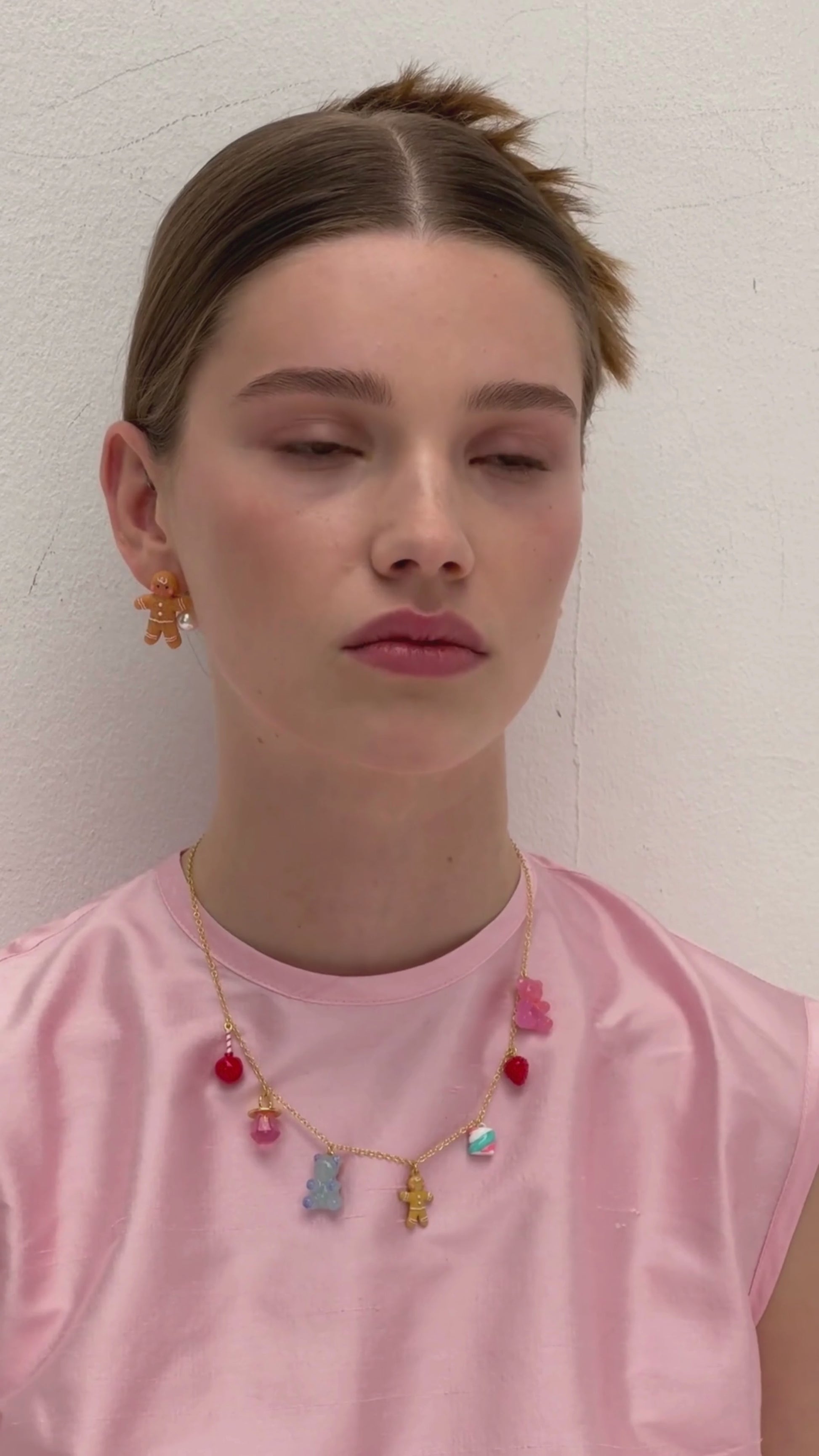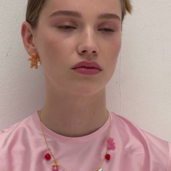 Pendant necklace with gingerbread man, marshmallow bear, lollipop and strawberry, delicately hand-enamelled. The Hansel and Gretel collection playfully revisits the famous fairy tale, where sweet treats and gingerbread houses are as tempting as they are treacherous. Protected by rings and amulets, our heroes face the witch in an enchanted world of sweet temptation and magical salvation.