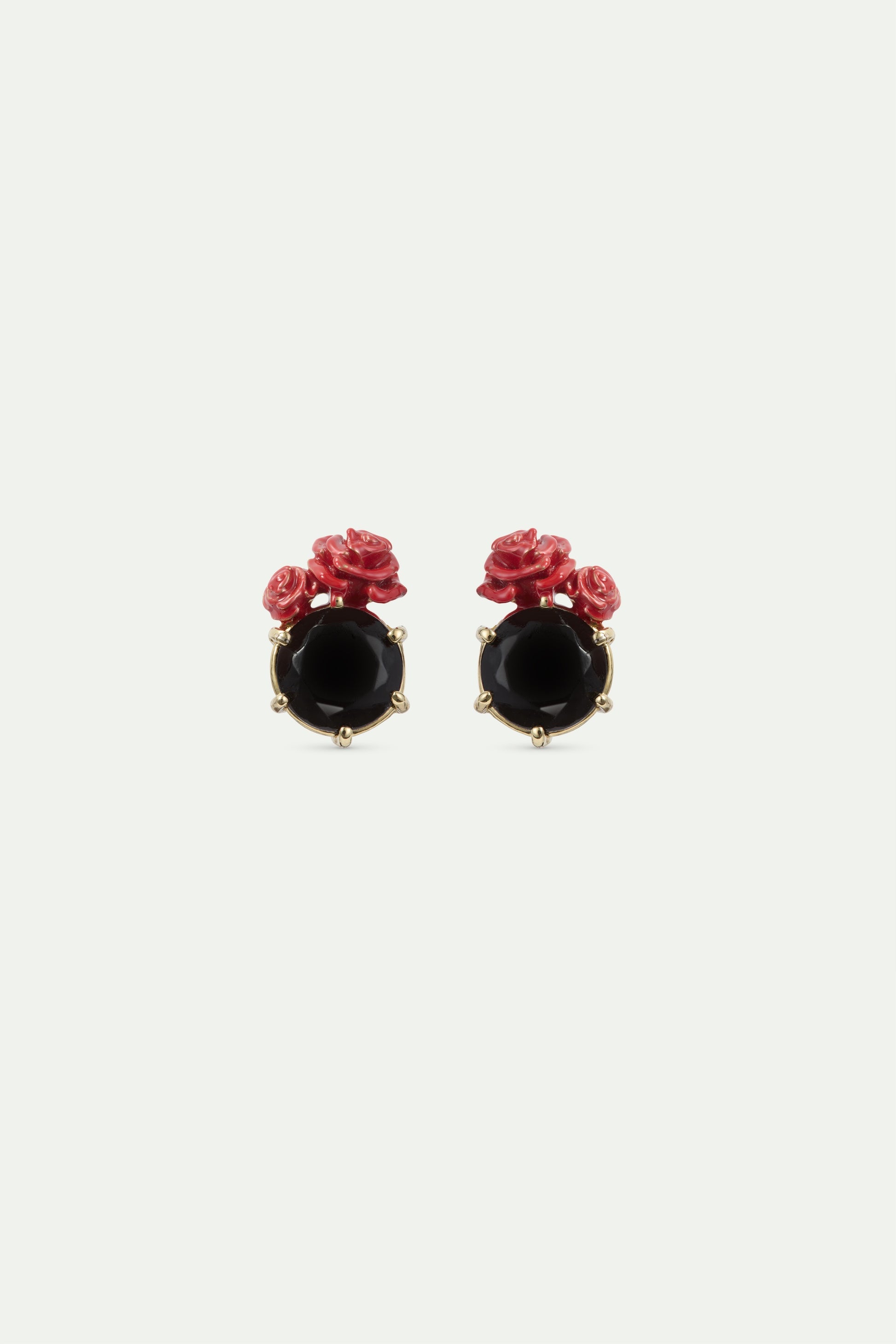 Black Faceted Stone And Red Rose Sleeper Earrings