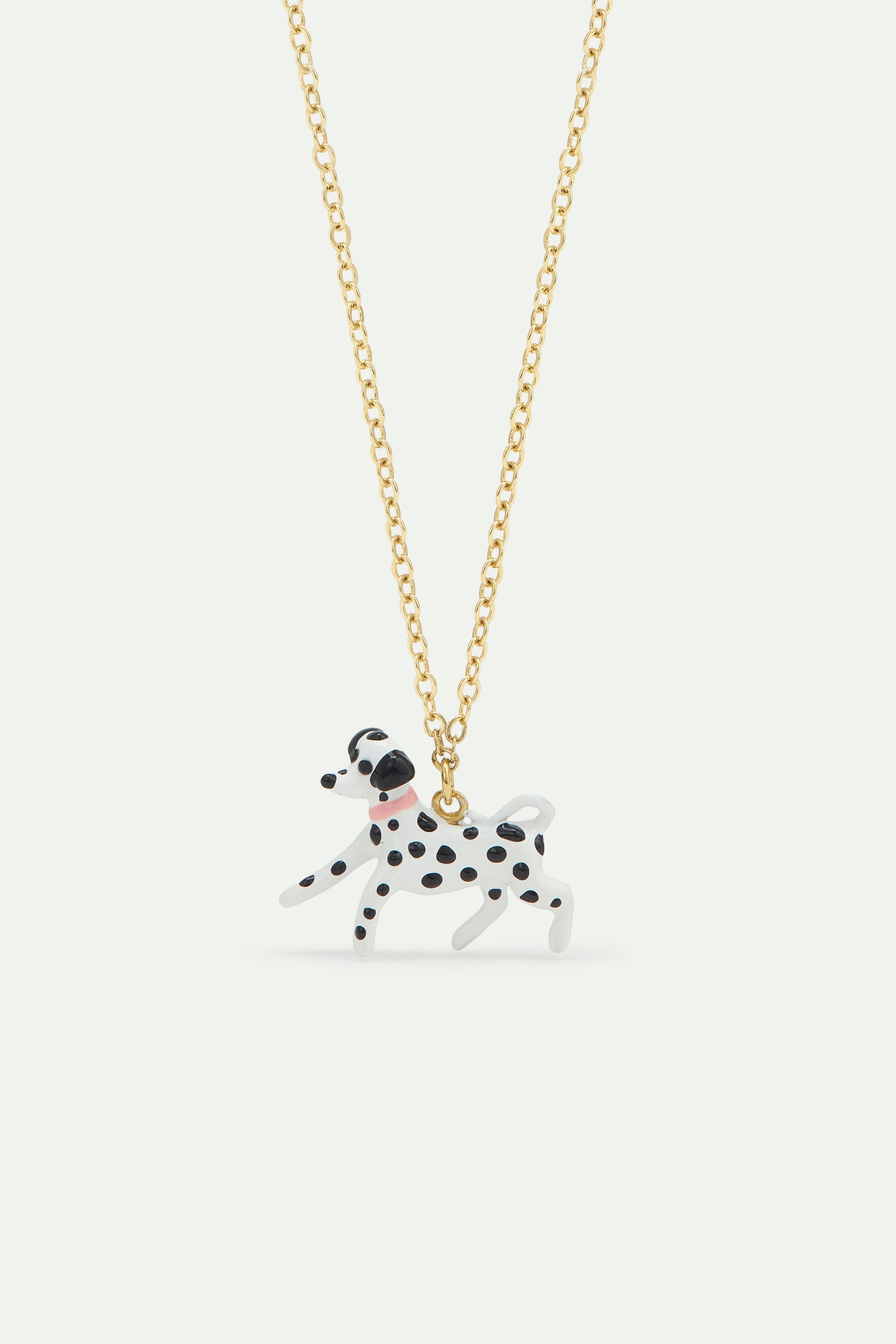Description: Embrace Parisian charm with this exquisite hand-enamelled pendant necklace, featuring an adorable black and white Dalmatian dog adorned with a delicate pink collar. The elegant gold-plated brass chain adds a touch of timeless sophistication. This season, Les Néréides Loves Animals invites you to stroll through the romantic streets of Paris alongside three iconic canine companions: a graceful poodle, a charming dachshund, and a playful dalmatian. With every purchase, 15% of the proceeds from these cherished jewellery pieces are proudly donated by the LNLA foundation to associations worldwide dedicated to animal welfare, allowing you to wear your compassion beautifully.