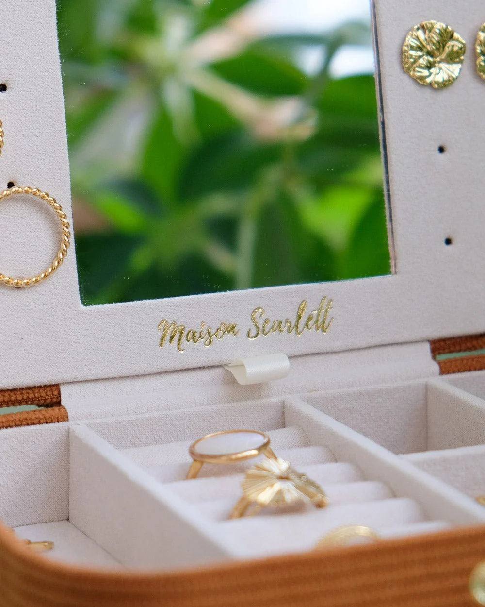 If Brigitte seems too big for your travels, you can find our travel jewelry boxes with more compact formats. For the home, explore our selection of spacious jewelry boxes with convenient slots, ideal for organizing your jewelry collection.