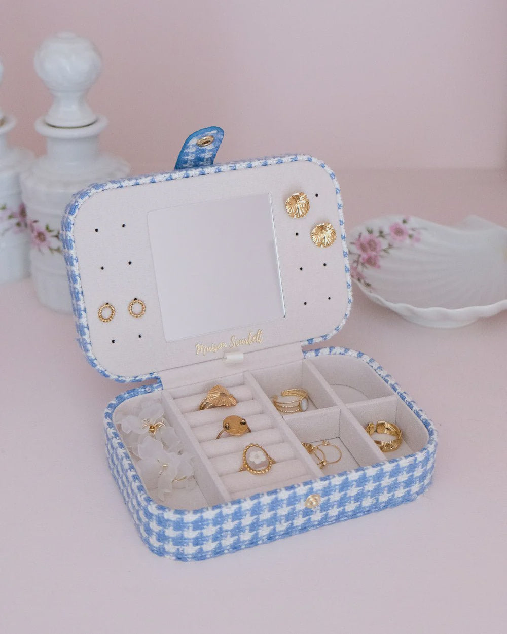 Brigitte in houndstooth is the largest travel jewelry box in our collection. You can safely carry dozens of pieces of jewelry with you on vacation and other trips. But rest assured, it is still compact, practical and easy to slip into a suitcase.