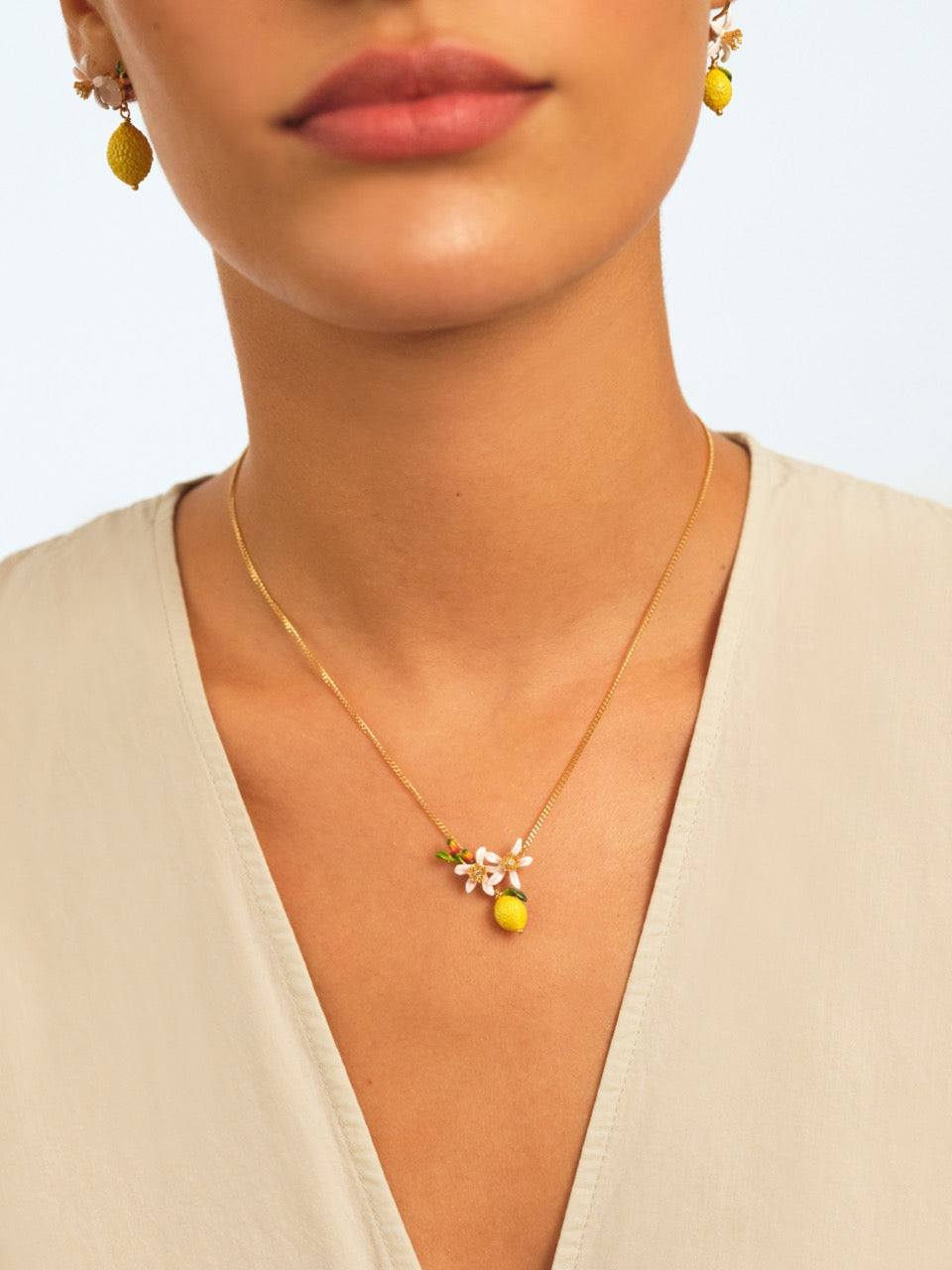 The Lovely Lemon collection from La Maison Les Néréides offers you fruity and colourful jewellery. This statement necklace is composed of a lemon with its blossoms and pale pink flower buds. This hand-enamelled jewel will perfectly match the earrings and bracelets from the same collection.