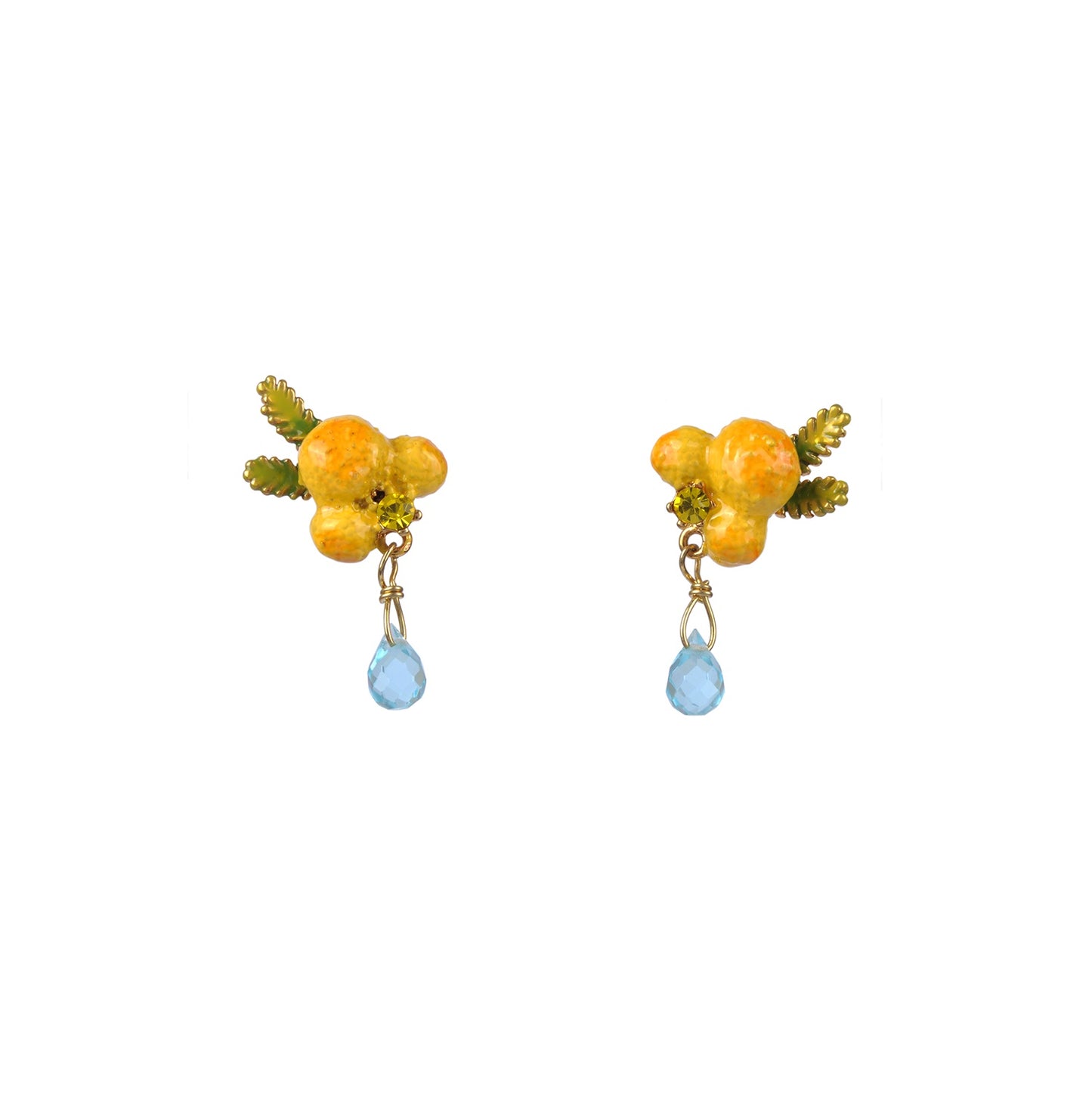 Those stud earrings with the mimosa flower and the little leaves from the Provence Garden collection are composed of elements made of enamelled brass and adorned with a sky-blue crystal bead. This colourful and fruity jewellery is an invitation to dreams of Provencal walks guided by the cicadas' song. The elements representing fruits and foliage are made in the purest La Maison Les Néréides style.