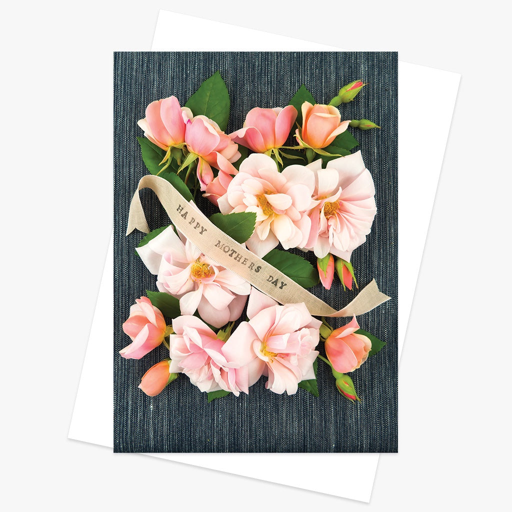 Perle D'Or roses from the petal & pins garden and hand stamped vintage ribbon on a linen background create a beautiful image on this keepsake card for Mothers Day.