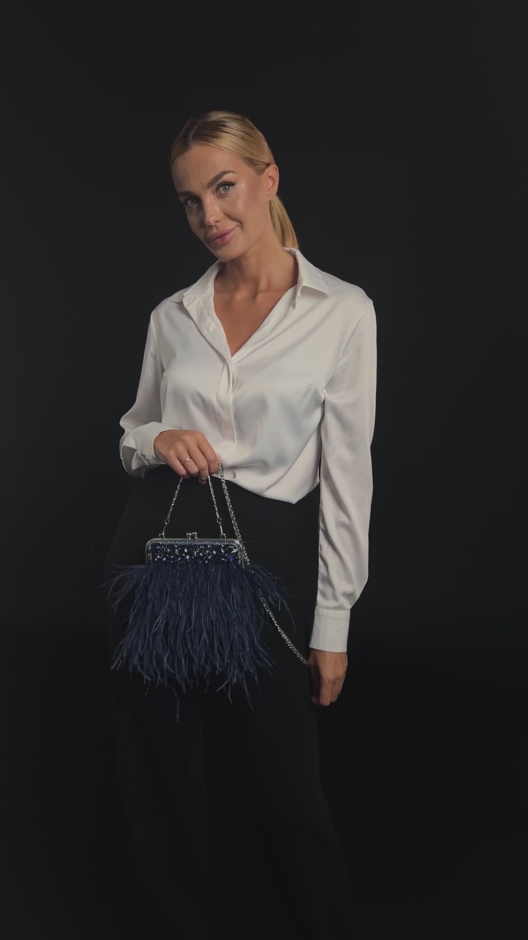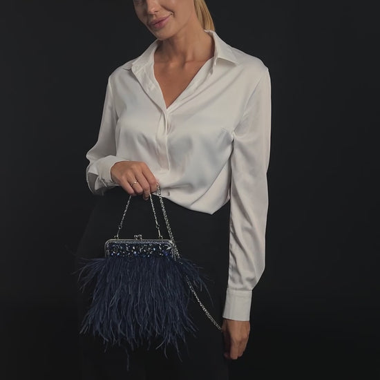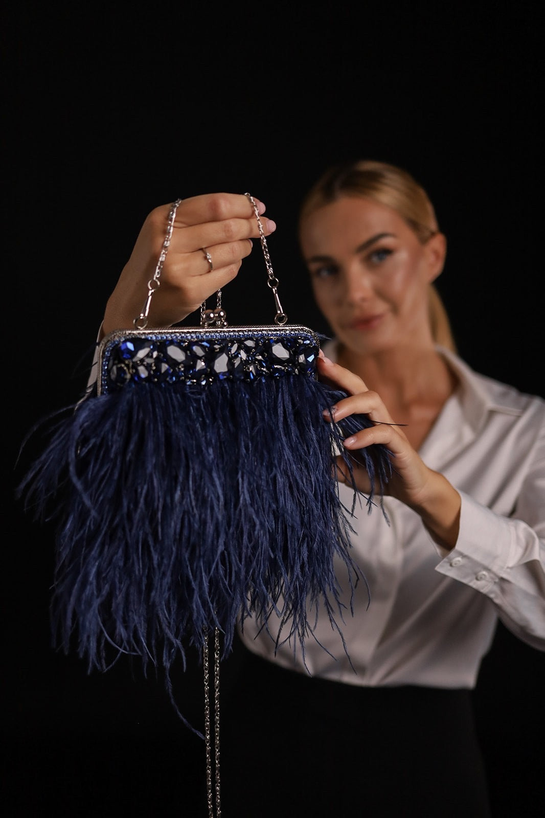 Elevate your style with our Navy Feather Handbag. Made with luxurious ostrich feathers, bohemian glass rhinestones, and velvet, this handbag exudes a unique and sophisticated look. The metal fittings with nickel addition ensure durability and the silver tone chain adds a touch of elegance.