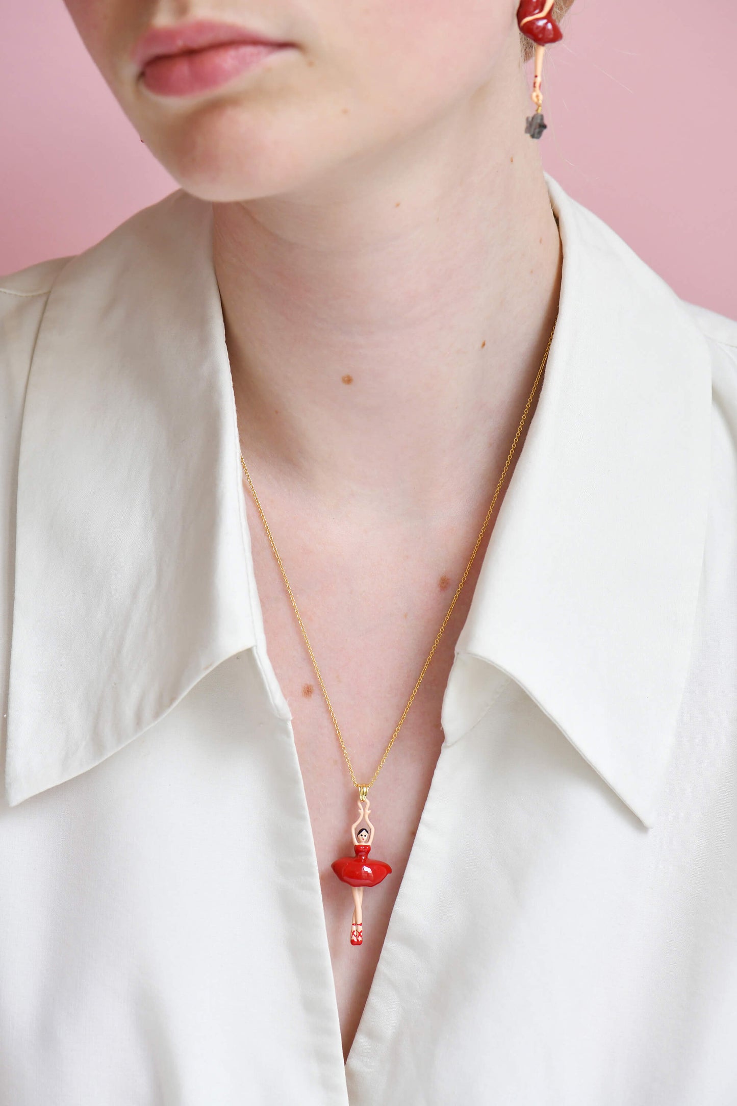 Crafted from high-quality materials, this necklace features 14k gold plated brass and hand-painted enamel, ensuring it is both durable and nickel-free. With a length of 55cm and a ballerina length of 4cm, this necklace is the perfect addition to any outfit. Its width of 1.2cm adds a touch of sophistication and elegance to your look. Elevate your style with the Pas de Deux Red Red Necklace from Les Nereides.