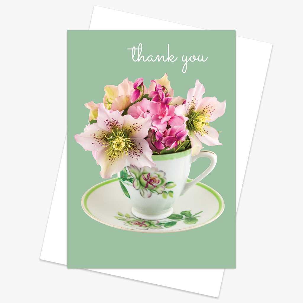 Thank you greeting card - designed with violets, hellebores and geraniums from the petal & pins garden with vintage teacup.