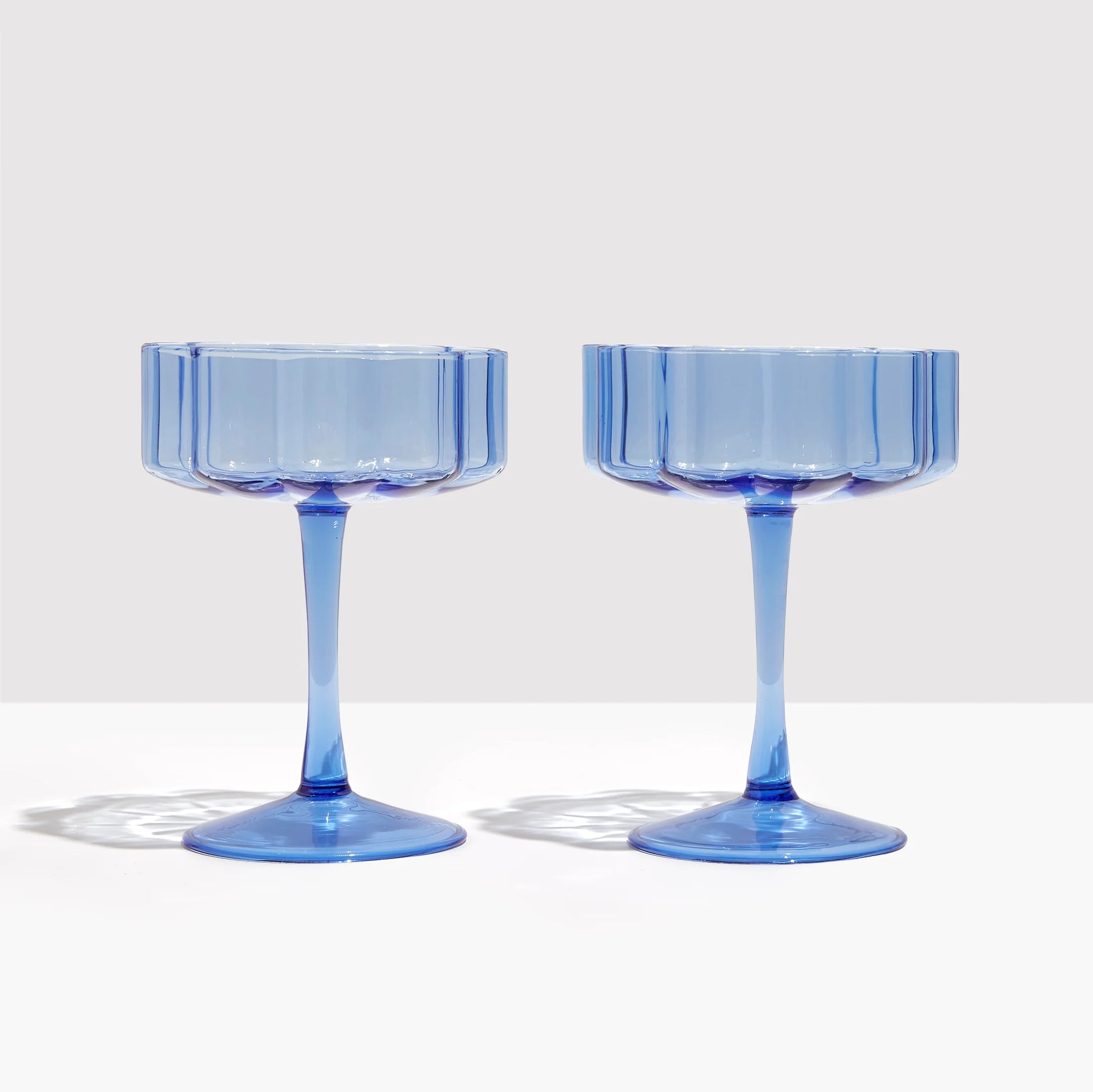 FAZEEK's WAVE COUPE GLASSES - BLUE are a modern and playful reimagining of a glassware classic. Featuring an elegant, elongated stem and a wide bowl embellished with beautiful signature rippled edges. These hand-blown glasses are the ultimate vessel to serve your favourite sparkling varietals, decadent cocktails or delicious desserts.