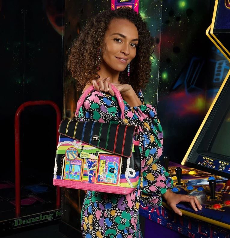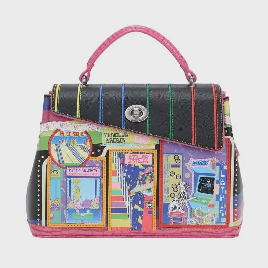 ‘’Eat, Sleep, Arcade, Repeat’’! The Vendula Arcade Mini Grace Bag is a beautiful bag made of vegan leather. It is deceptively spacious, with two compartments and a few pockets to keep all of your belongings tidy. Carried like a handbag or worn over the shoulder, it will add a touch of elegance to any outfit, and you will certainly want to use it every single day. The arcade-themed artwork and colourful details will catch the eye and not a day will go by without anyone compliment you on this little masterpiece. It really is an out of this world accessory, isn’t it!? Wait until they see your matching wallet!